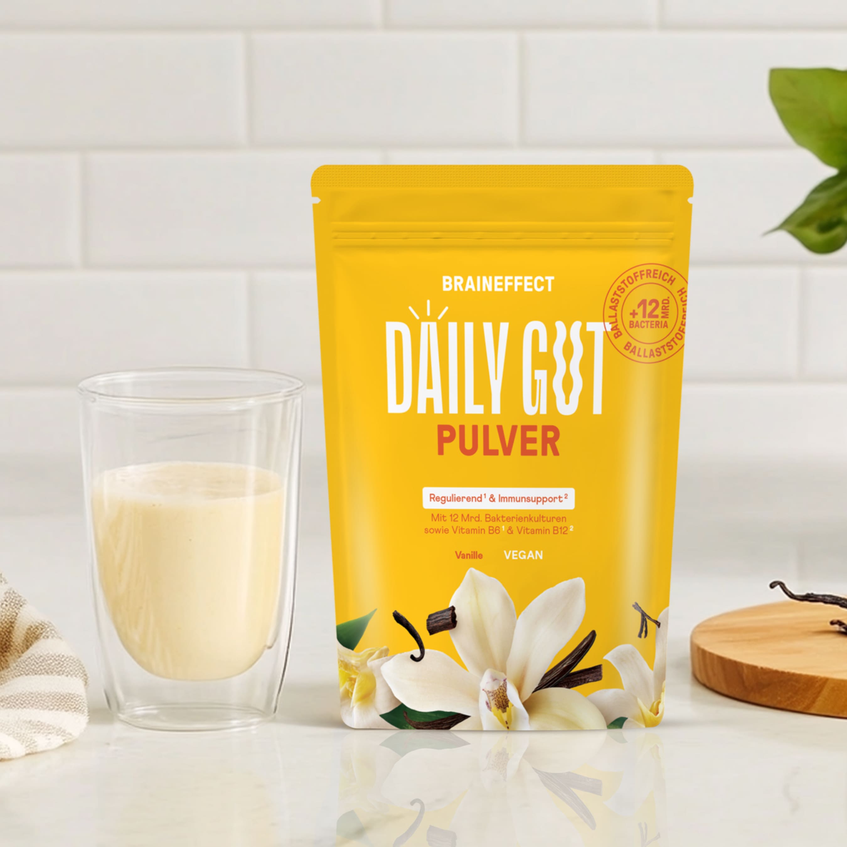 It tastes uniquely delicious and is prepared in a flash: 2 heaped teaspoons of DAILY GUT are perfect in smoothies, porridge, muesli, yogurt, or simply as a drink. Choose a fruity or lemony classic, or give your breakfast a vanilla or creamy chocolate upgrade. The small white sachet in the package is not suitable for consumption, but guarantees a perfect environment for bacteria.