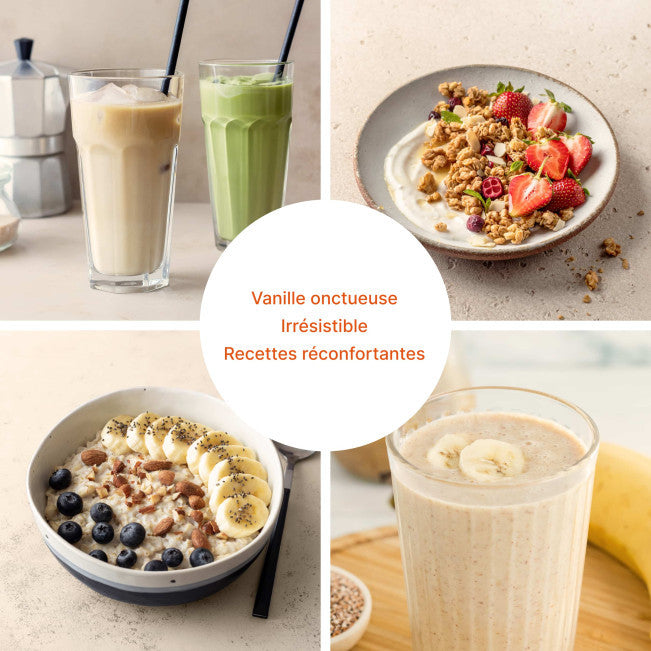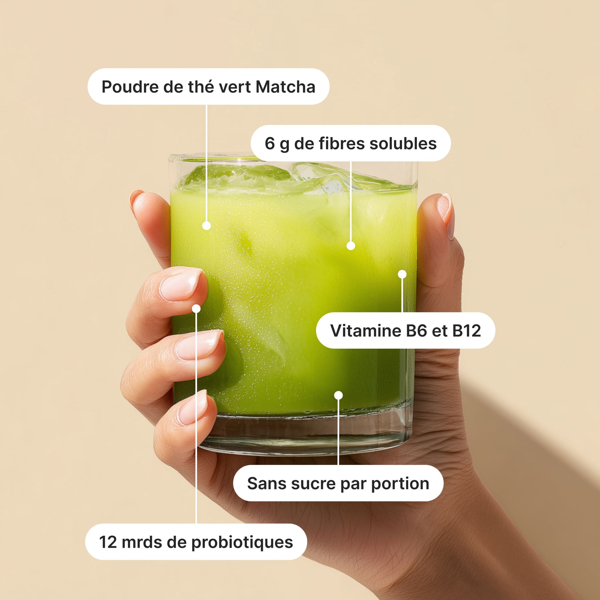 Dextrine résistante (fibres alimentaires issues du maïs), protéines de riz, 10 % de poudre de thé vert matcha, épaississants : gomme de guar, gomme xanthane ; fibres d'acacia, arôme naturel de thé matcha, sel, mélange de bactéries (Lactobacillus brevis, Lactobacillus bulgaricus , Lactobacillus casei , Lactobacillus paracasei , Bifidobacterium longum , Bifidobacterium infantis , Bifidobacterium lactis , Bifidobacterium breve, Lactobacillus rhamnosus , Lactobacillus acidophilus, Bifidobacterium bifidum, Lactobacillus plantarum), édulcorant : glycosides de stéviol (issus de la stévia) ; riboflavine, vitamine B6, thiamine, vitamine B12.