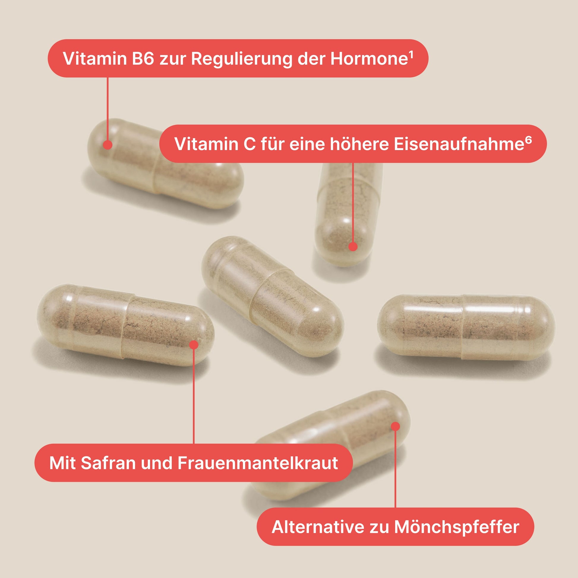 Magnesium Komplex (Magnesiumcitrat, Magnesiumbisglycinat, Magnesiummalat), Hydroxypropylmethylcellulose (pflanzliche Kapselhülle), Frauenmantelkrautpulver (Alchemilla vulgaris), Vitamin C, Safranblüten-Extrakt***, Eisen, Vitamin B6, Thiamin, Riboflavin, Folsäure (Calcium-L-methylfolat).