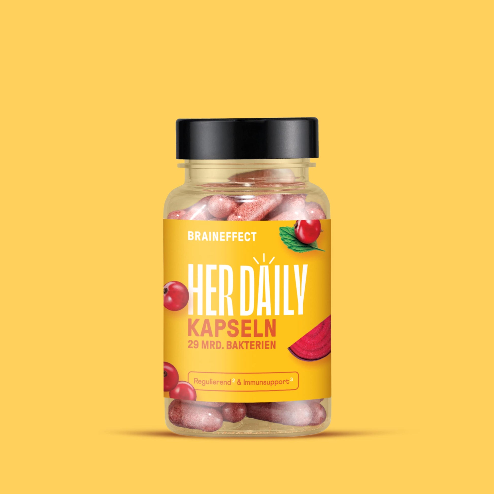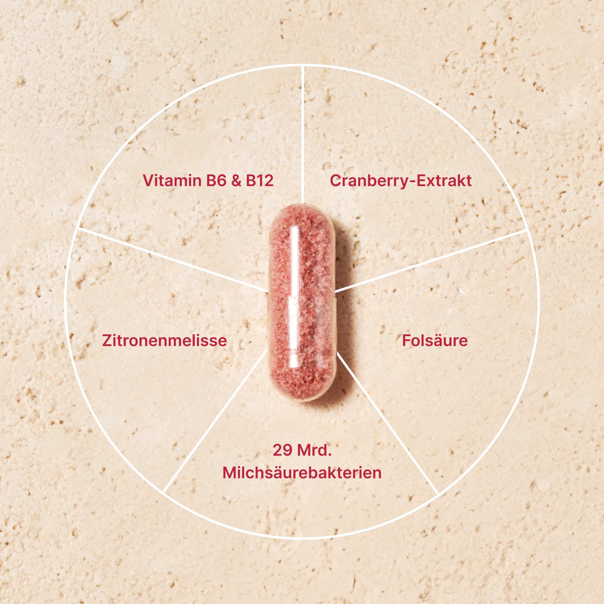 Dextrine résistante (fibres provenant du maïs), agent d'enrobage : hydroxypropylméthylcellulose et copolymère de méthacrylate neutre (enveloppe de gélule) ; 15,2 % poudre de racine de betterave rouge (Beta vulgaris), poudre de fibre d'acacia (Acacia seyal), Bifidobacterium lactis, Lactobacillus rhamnosus, Lactobacillus paracasei, 4,8 % extrait de feuille de mélisse citronnée (Melissa officinalis), 4,8 % extrait de fruit de canneberge (Vaccinium macrocarpon), Lactobacillus acidophilus, Lactobacillus crispatus, Lactobacillus plantarum, Lactobacillus reuteri, Bacillus coagulans, vitamine B6, acide folique (vitamine B9), vitamine B12.