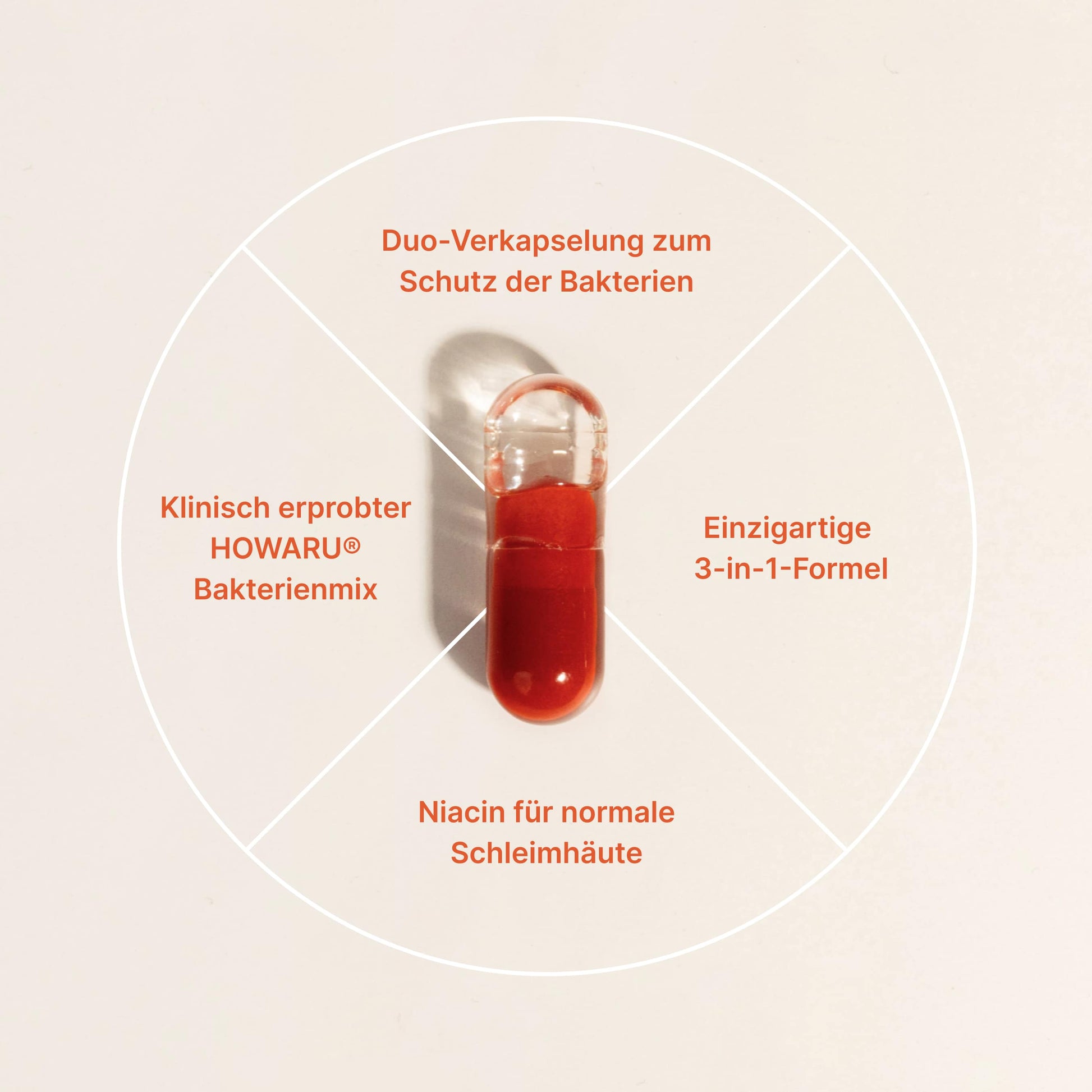 humectant : glycérol ; Hydroxypropylméthylcellulose (enveloppe de capsule végétale), 15 % fermentat déshydraté (Saccharomyces cerevisiae)¹, fructooligosaccharides, mélange de bactéries HOWARU® Restore II² (Lactobacillus acidophilus NCFM®, Lactobacillus paracasei Lpc-37TM, Bifidobacterium lactis Bi-07TM, Bifidobacterium lactis Bl-04TM), eau, Niacine (Vitamine B3) antiagglomérant : Dioxyde de silicium ; gélifiant : gomme gellane ; colorant : oxyde de fer.