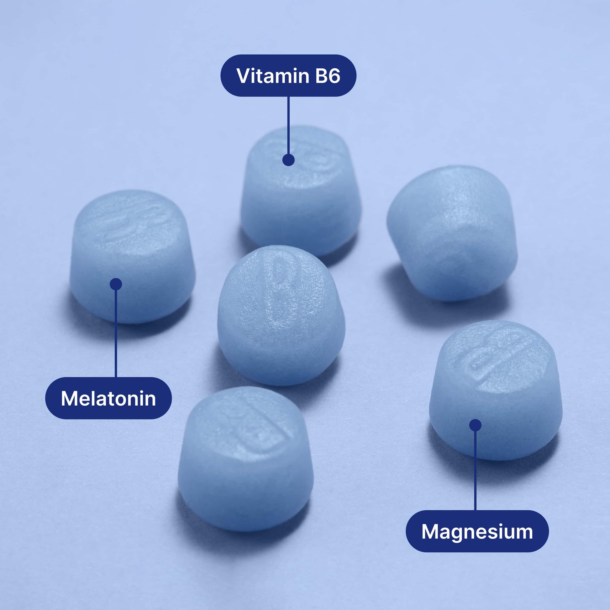 Süßungsmittel: Maltitsirup, Steviolglykoside (aus Stevia); modifizierte Stärke, Magnesiumlactat, Säuerungsmittel: Zitronensäure; Säureregulator: Natriumcitrat; natürliches Aroma, Vitamin B6, Melatonin, färbende Lebensmittel: Spirulina-, Apfel- und Karottenkonzentrat; Überzugsmittel: Carnaubawachs.