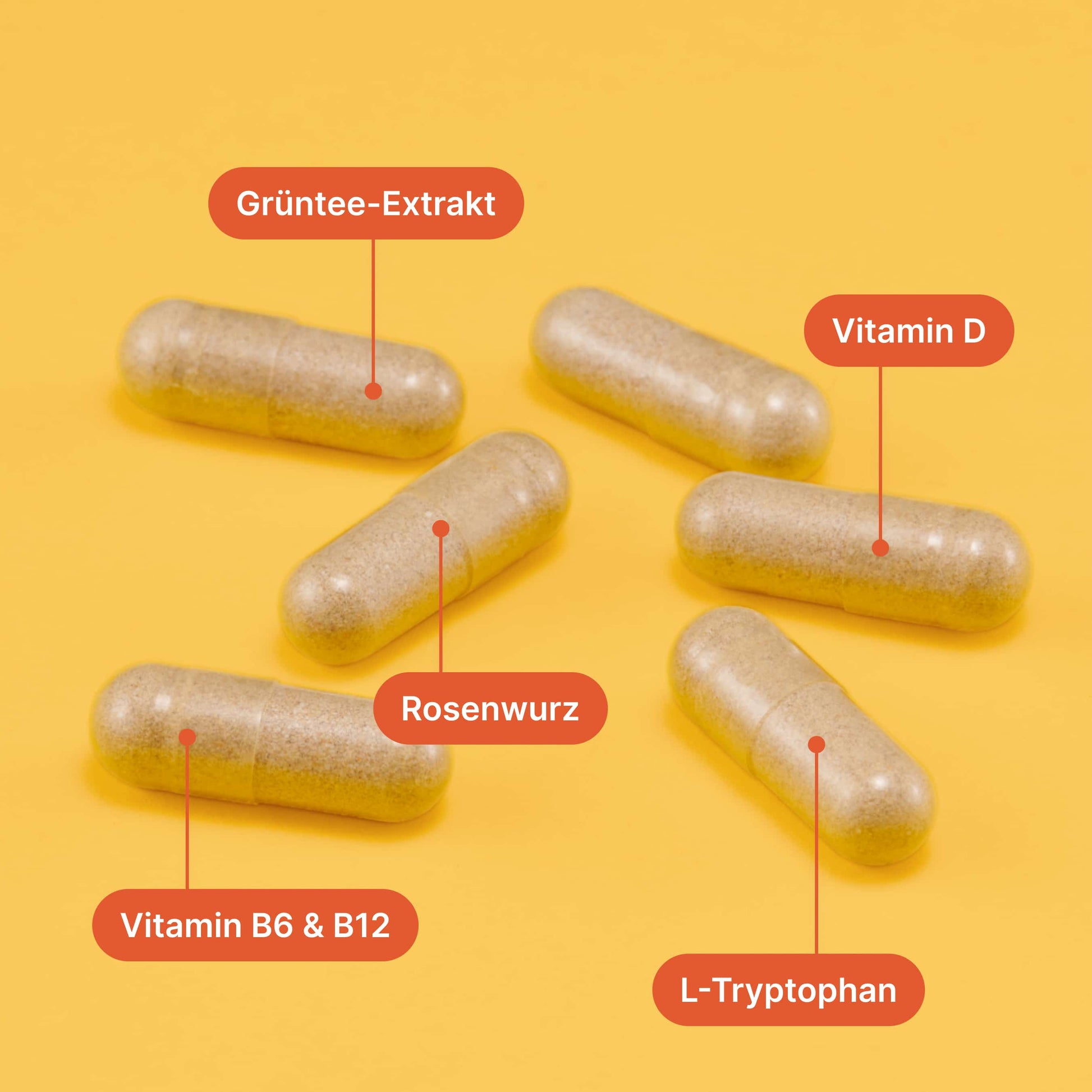 L-Tryptophan, Hydroxypropylmethylcellulose (pflanzliche Kapselhülle), Raupenpilz-Extrakt, Rosenwurz-Extrakt, Vitamin K2 (MK-7 trans), Kurkumawurzel-Extrakt, Vitamin C, Thiamin, Zink, Pantothensäure, Vitamin B6, Vitamin D3, Niacin, Schwarzer-Pfeffer-Extrakt, Folsäure, Vitamin B12